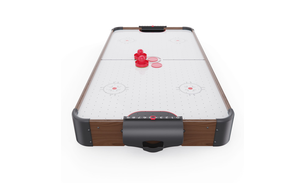 Игровой стол оснащён вентилятором на 220V, создающим воздушную подушку под шайбой. Это обеспечивает лёгкое и быстрое скольжение по полю, делая игру более захватывающей и реалистичной.